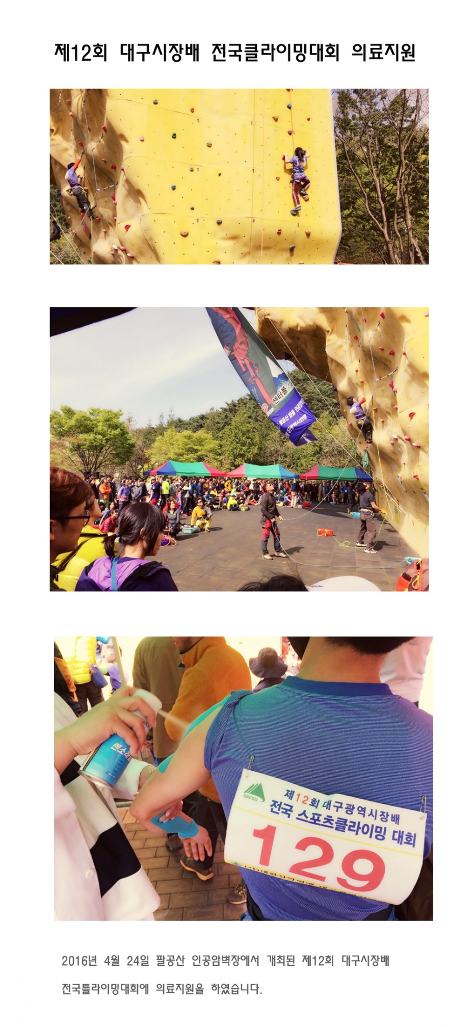 제 12회 대구시장배 전국클라이밍대회 의료지원 페이지 정보 작성자굳센병원 댓글0건 조회13,359회 작성일16.11.21 10:08 본문 제 12회 대구시장배 전국클라이밍대회 의료지원 이전글한국권투연맹 업무 협약식 다음글해외 의료진 수술참관 및 단기연수