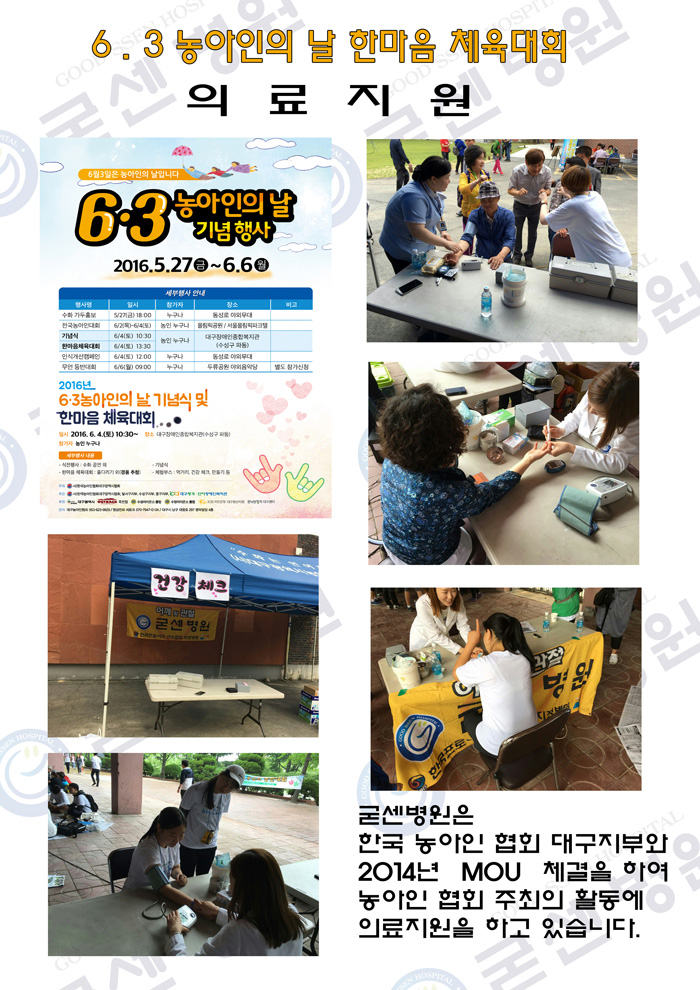 농아인의 날 한마음 체육대회 의료지원 페이지 정보 작성자굳센병원 댓글0건 조회13,451회 작성일16.11.21 10:11 본문 농아인의 날 한마음 체육대회 의료지원 이전글2016년 SK 핸드볼 코리아 리그 의료지원 다음글대구,경북 장애인 합창대회 의료지원
