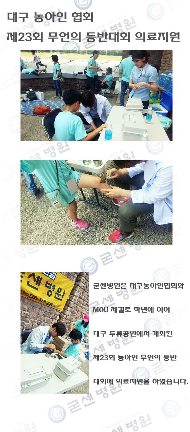 대구 농아인협회 주최 <제 23회 무언의 등반대회 의료지원> 페이지 정보 작성자굳센병원 댓글0건 조회12,168회 작성일16.11.20 13:05 본문 대구 농아인협회 주최 <제 23회 무언의 등반대회 의료지원> 이전글포항선린병원 김윤기선생님 어깨수술 참관 다음글원내 응급환자발생시 모의훈련 시행