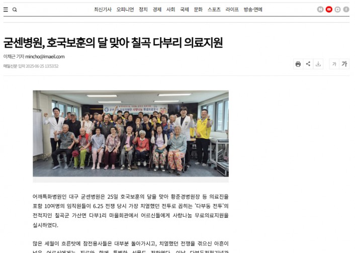 굳센병원,호국보훈의 달 맞아 칠곡 다부리 의료지원 [매일신문][영남일보]