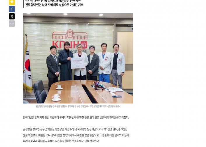 경북대병원 정형외과 동문 의료진 뜻깊은 동행..굳센병원 병원장,모교에 발전기금 3천만원전달[영남일보]