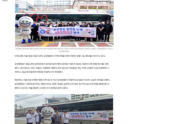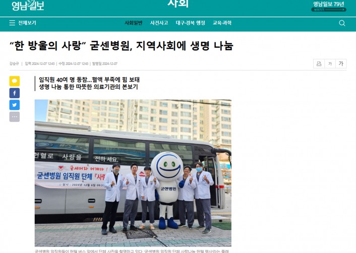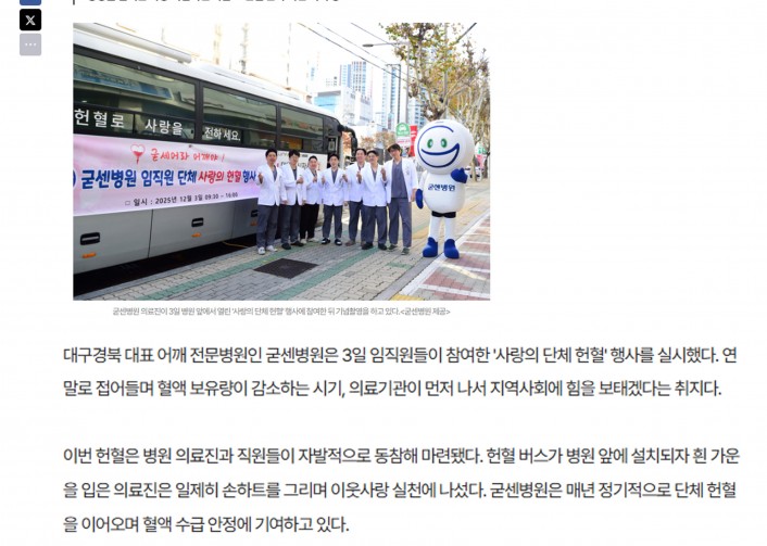 어깨 중점 굳센병원, 수술실 대신 헌혈 버스 올랐다.'생명 나눔'실천 [영남일보][매일신문]