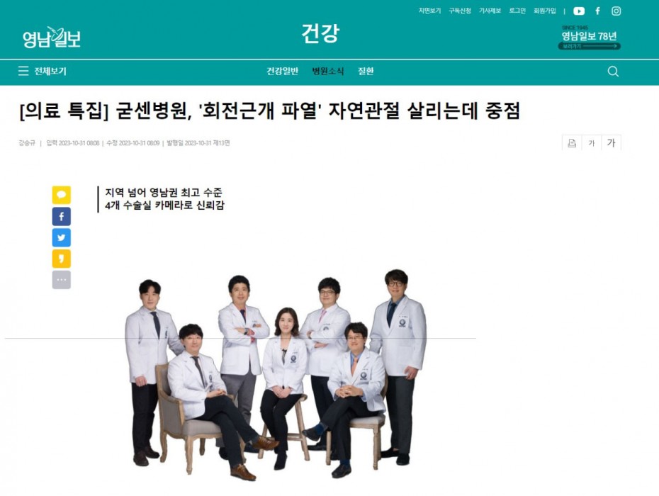 굳센병원,'회전근개 파열'자연관절 살리는데 중점[영남일보] 페이지 정보 작성자굳센병원 댓글0건 조회601회 작성일23.10.31 10:29 관련링크 https://www.yeongnam.com/web/view.php?key=20231018010002188 478회 연결 본문 이전글굳센병원 윤성대 병원장,경북대에 발전기금 1000만원 전달[뉴시스][교수신문] 다음글굳센병원,어깨질환통증 증상발견즉시 치료하는 것이 완치의 첫 걸음[매일신문]