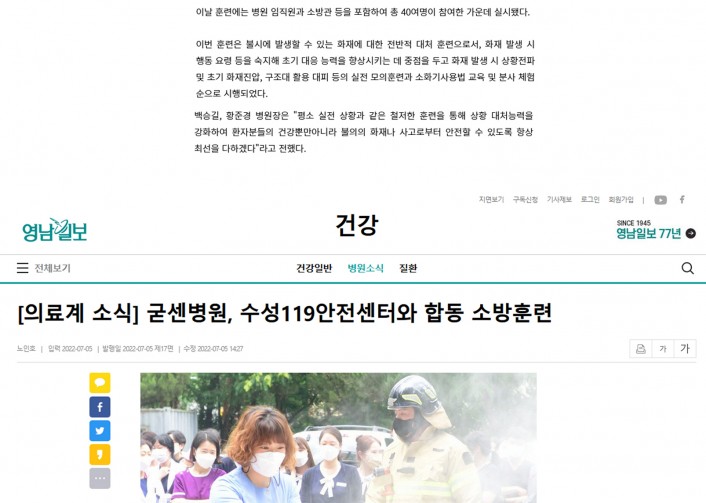 굳센병원과 수성119안전센터가 함께하는 합동 소방훈련(매일신문, 영남일보)