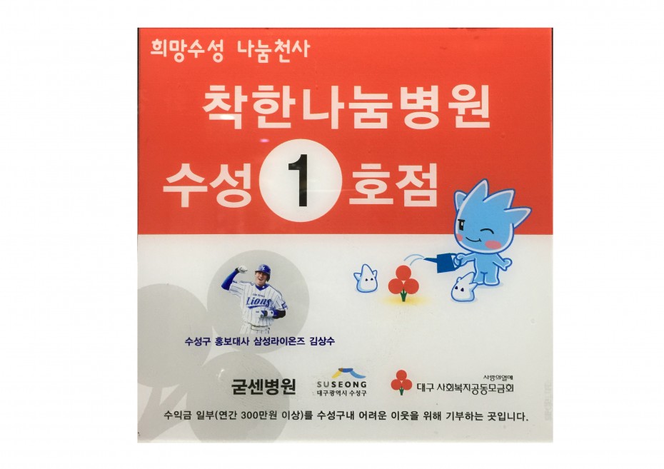 수성구 "착한나눔가게 병원급 1호점" 지정 페이지 정보 작성자굳센병원 댓글0건 조회2,040회 작성일16.11.19 14:43 본문 이전글[제7차 세계 물포럼] 공식의료지원병원 다음글굳센병원에서 수성구 저소득층 무료수술 시행