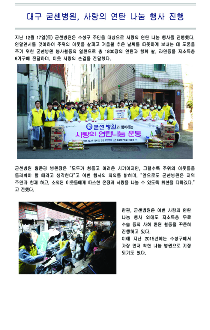 대구 굳센병원, 사랑의 연탄 나눔 행사 진행 페이지 정보 작성자굳센병원 댓글0건 조회13,204회 작성일16.12.30 09:04 본문 대구 굳센병원, 사랑의 연탄 나눔 행사 진행 이전글12월 월례회, 인사발령, 생일축하 사진 입니다. 다음글굳센병원 "사랑의 연탄나눔운동"자원봉사-2