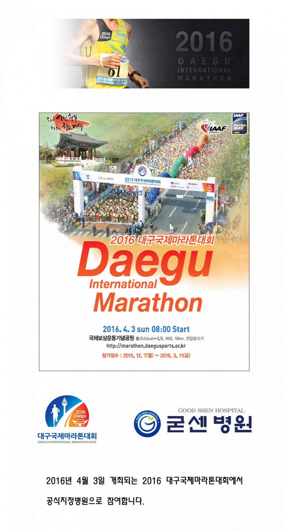 2016년 대구 국제마라톤대회 지정병원 선정 페이지 정보 작성자굳센병원 댓글0건 조회13,370회 작성일16.11.21 10:02 본문 2016년 대구 국제마라톤대회 지정병원 선정 이전글대구수성경찰서 상호협력 MOU 체결 다음글황준경 원장 어깨수술기법 세계견주관절학회 E-poster 채택