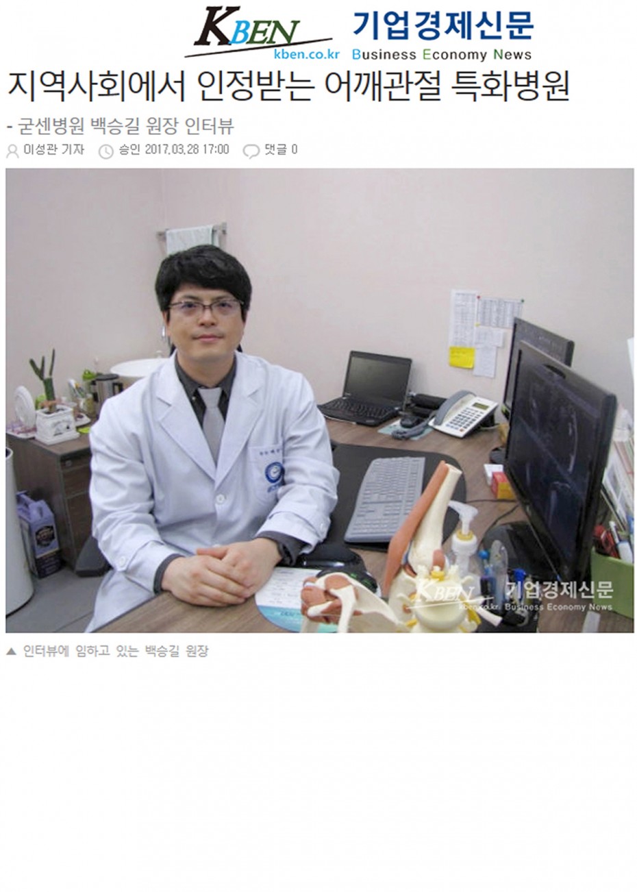 지역사회에서 인정받는 어깨관절 특화병원-백승길 원장님 인터뷰 페이지 정보 작성자굳센병원 댓글0건 조회2,184회 작성일17.04.05 16:45 본문 이전글사회에 봉사하는 어깨질환 특화 병원 - 김동욱 원장님 인터뷰 (일간스포츠) 다음글2017 대한민국 미래를 여는 인물 대상 황준경병원장님 수상. (시사투데이 주최·주관)