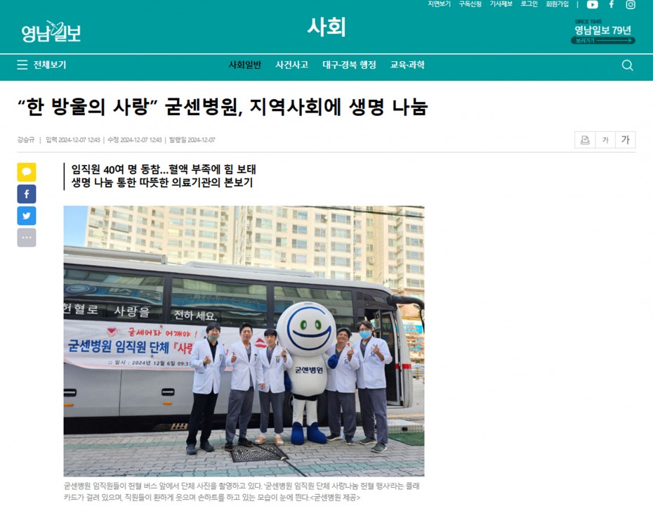 "한 방울의 사랑" 굳센병원, 지역사회에 생명 나눔[영남일보] 페이지 정보 작성자굳센병원 댓글0건 조회346회 작성일24.12.10 09:23 관련링크 https://www.yeongnam.com/web/view.php?key=20241207010001230 184회 연결 본문 이전글혈액 수급난 속 굳센병원, 헌혈로 생명 살리기 동참[영남일보],[매일신문] 다음글굳센병원,봉사나눔가치 실천하는 '상생병원' [영남일보]